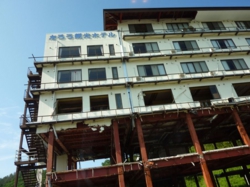初日は宮古市の田老地区、堤防を越えた津波ですべてが失われてしまった地域です。今回、この研修に同行していただいたガイドの方はここに住んでおりましたが、この津波で家屋を失ってしまいました。写真①、写真②のようにホテルのほとんどが呑み込まれてしまいました。