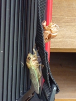 そのセミの抜け殻が、木々ではなく、昨日行った釣り道具を庭に干しておいたら、その道具に抜け出したセミと一緒に留まっていたので、シャッターを切りました。面白いところで羽化しました。