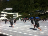 その一つを紹介します。まず、平均台を渡ります。次にフラフープを10回回します。その次は玉入れです。これは入るまで続けます。入らなくなると焦ります。気持ちを落ち着けて狙います。やっと入ると次はフットボール(楕円)をポイントまで蹴って戻ります。この間往復40Mくらい、楕円ですからコントロールが難しいのです。その最後の仕上げは、スタート時点の円に足でボールを完全に戻すまでがルールです。これが終わるとやっと駆け足で次の選手にバトンタッチという具合です。これ以外にも頭のてっぺんから足のつま先まで、全身を使っての競技が繰り広げられました。少人数だからこそ細かな指導が行き届くとのことでした。競技を終えた児童自らがかたづけを行っているのもほほえましい光景でした。